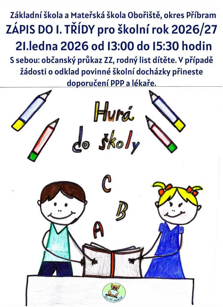 Zápis do první třídy proběhne 21.ledna 2026 od 13:00 do 15:30 hodin.